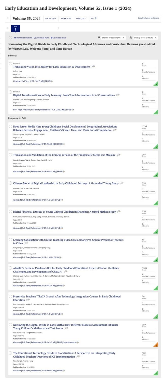 由kaiyun體育登錄網頁入口“學前教育數(shù)字化轉型研究中心”的羅文蔚副教授擔任客座編輯的SSCI二區(qū)期刊《Early Education and Development》的???,聚焦于“縮小幼兒教育中的數(shù)字鴻溝:技術進步與課程改革”。羅文蔚副教授還撰寫了題為“幼兒教育數(shù)字化轉型:從觸摸互動到人工智能對話”的卷首語。該??接憽凹夹g與幼兒教育融合”的主題,包含9篇經過同行審議的文章,分為5個主題。??延?/span>2023年12月在線發(fā)布,2024年1月將出版紙質版。