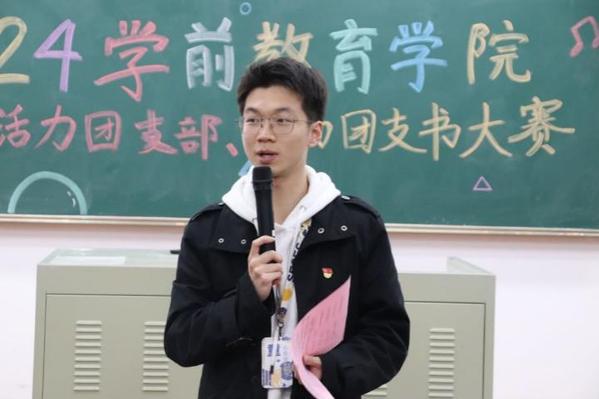 周澤龍為本次大賽致辭,他以“書卷味”“汗水味”“泥土味”“擔(dān)當(dāng)味”為出發(fā)點(diǎn),要求各支部以本次比賽為契機(jī),繼續(xù)認(rèn)真學(xué)習(xí)宣傳貫徹黨的二十大精神,充分運(yùn)用具有專業(yè)特色的多樣化表現(xiàn)形式,全面展示基層團(tuán)支部的創(chuàng)新與實(shí)踐成果,展現(xiàn)學(xué)前學(xué)子蓬勃的青春風(fēng)采,并不斷促進(jìn)團(tuán)支部之間的合作交流,為推動(dòng)學(xué)院團(tuán)委基層支部建設(shè)不斷建言獻(xiàn)策。
