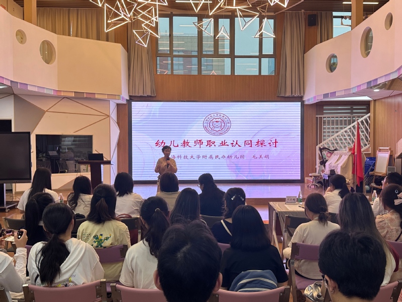 隨后,上??萍即髮W附屬幼兒園園長毛美娟就“幼兒教師職業(yè)認同探討”為主題進行了經驗分享。毛園長結合自身教學經驗及幼兒園實際案例,深入剖析幼兒教師職業(yè)的特點和要求,并為同學們在實習期的擇業(yè)和就業(yè)提供了諸多建議,鼓勵其樹立正確的職業(yè)觀念和堅定的職業(yè)信念,為職業(yè)生涯發(fā)展打下堅實基礎。