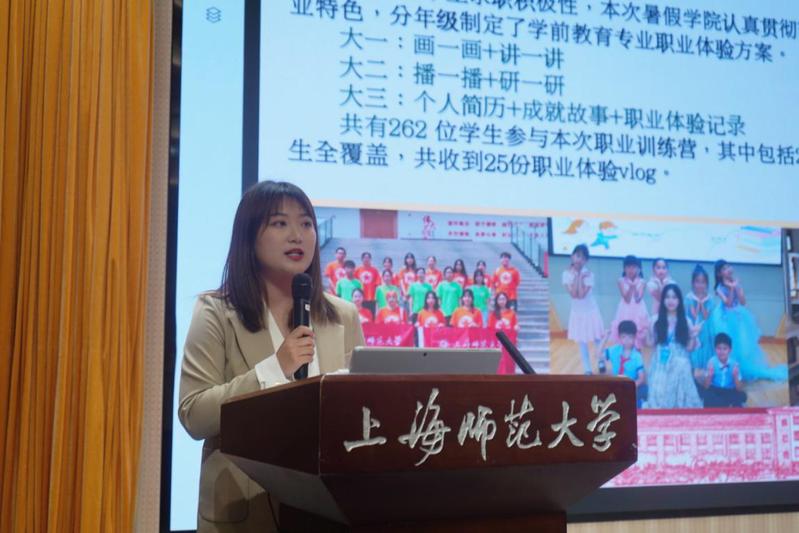 高湘萍代表學(xué)院對黃思遠(yuǎn)、劉欣媛、許晨曦等13名榮獲“上海師范大學(xué)暑期職業(yè)訓(xùn)練營優(yōu)秀營員稱號”的同學(xué)們進(jìn)行了表彰。
