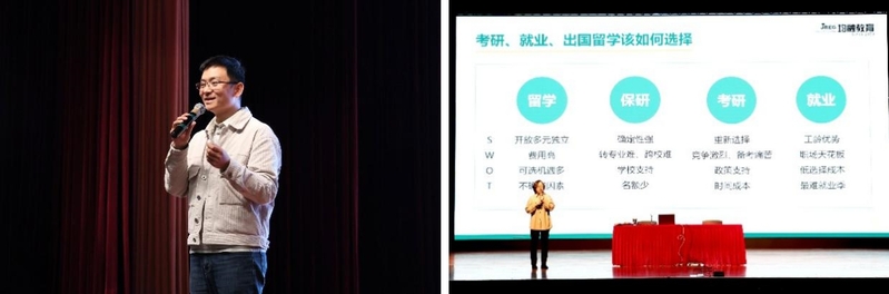 活動伊始,2022級本科生輔導(dǎo)員何坤鵬以當前就業(yè)與考研趨勢為切入點,通過詳實的數(shù)據(jù)分析,強調(diào)了提前規(guī)劃未來發(fā)展路徑的重要性。隨后,Jenny老師立足專業(yè)視角,運用SWOT分析法系統(tǒng)梳理了留學(xué)、保研、考研、就業(yè)四大發(fā)展方向的情況,并建議同學(xué)們從學(xué)術(shù)能力、職業(yè)技能、經(jīng)濟條件、家庭支持四個維度進行自我評估,制定個性化成長方案。