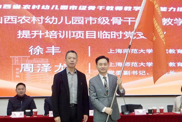 為加強培訓期間的思想引領與組織保障,培訓期間不僅組建了班級班委,還成立了“山西農村幼兒園市級骨干教師教學研究能力提升培訓項目臨時黨支部”。徐豐為“臨時黨支部”授旗,勉勵黨員教師發(fā)揮先鋒模范作用,帶動全體學員共同進步。