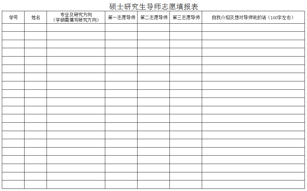 碩士研究生可以關(guān)注學(xué)院網(wǎng)站上的“導(dǎo)師個人簡介”,并在規(guī)定時間內(nèi)在線完成 “碩士研究生導(dǎo)師志愿填報表” (見附件1),每位碩士研究生可以按順序填報三個志愿。學(xué)科點則按學(xué)生所報志愿順序,供導(dǎo)師選擇。
