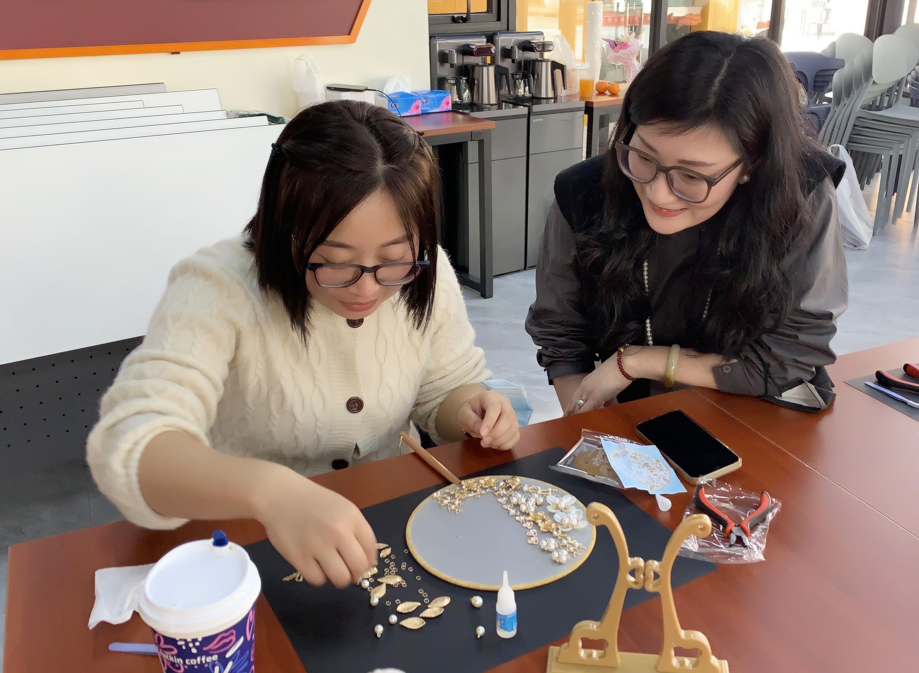 在手作老師的幫助下,大家選取自己喜歡的飾品,充分發(fā)揮個人創(chuàng)造力,在空白扇面上構(gòu)圖搭配,粘貼制作。通過巧手和想象,一柄柄或清新淡雅,或光彩閃耀的團(tuán)扇漸漸展現(xiàn),大家一邊交流制作心得,一邊互相欣賞著這些獨(dú)一無二的團(tuán)扇,現(xiàn)場一片歡聲笑語。制作完成后,老師們手持團(tuán)扇合影留念,盡顯知性之美。