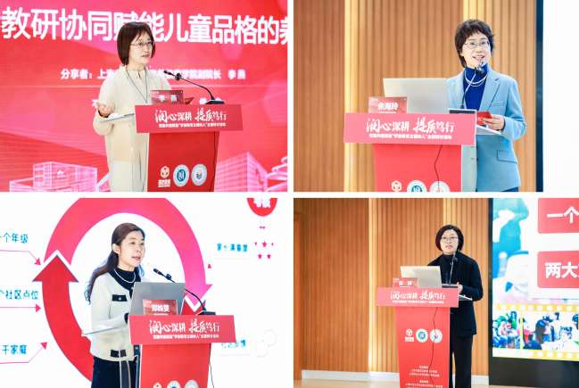 李燕以《產(chǎn)教研協(xié)同賦能兒童品格的養(yǎng)成》為題做經(jīng)驗(yàn)交流,從師資培訓(xùn)、課程實(shí)施、深入研究等方面分享協(xié)同育人機(jī)制和實(shí)施路徑。嘉定區(qū)安亭幼兒園學(xué)前教育集團(tuán)理事長(zhǎng)余海玲、嘉定區(qū)南翔幼兒園學(xué)前教育集團(tuán)理事長(zhǎng)鄧姝雯、嘉定區(qū)桃園幼兒園學(xué)前教育集團(tuán)理事長(zhǎng)吳婷聚焦提升教師育德能力和深化兒童品德啟蒙,介紹各自園所黨建引領(lǐng)學(xué)前立德樹人的園本化實(shí)踐。